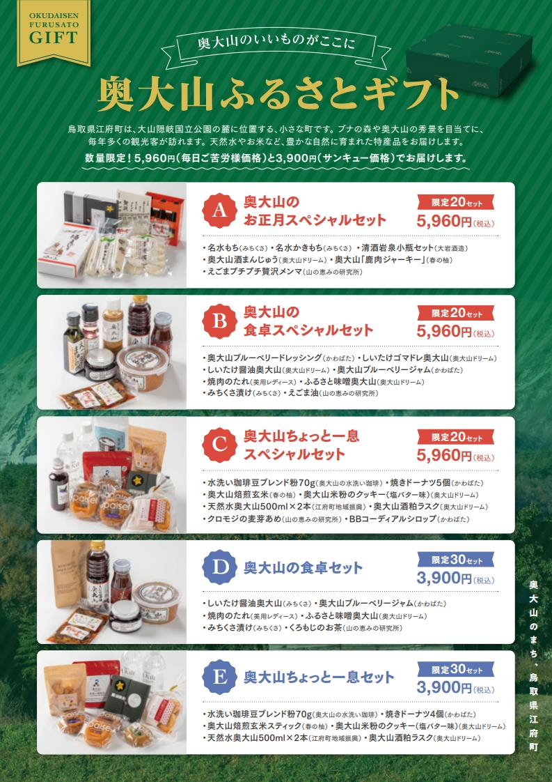 江府町の魅力がギュッと詰まったこの「ふるさとギフト」をぜひご利用頂ければ幸いです。